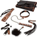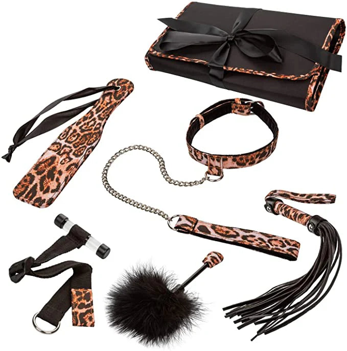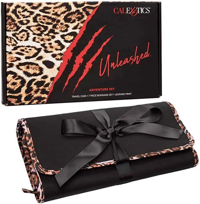 Give yourself over to the thrilling world of submission and dominance with the Unleashed™ Adventure Set. This travel-ready set includes everything needed to tease the lines between pleasure and pain. The designer 7-piece kit includes a faux leather flogger, sturdy dual-sided paddle, fluffy feather tickler, padded collar, chain leash, over the door restraint system and roll up travel case with hook.