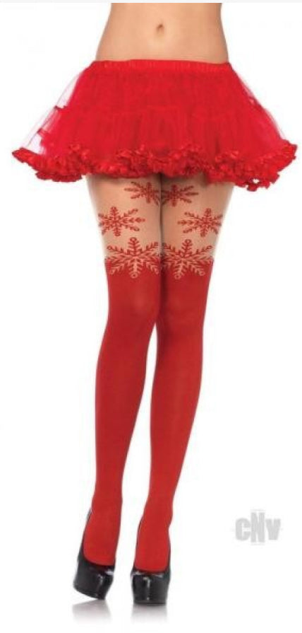 SPANDEX SNOWFLAKE OPAQUE PANTYHOSE W/SHEER THIGH ACCENT RED O/S